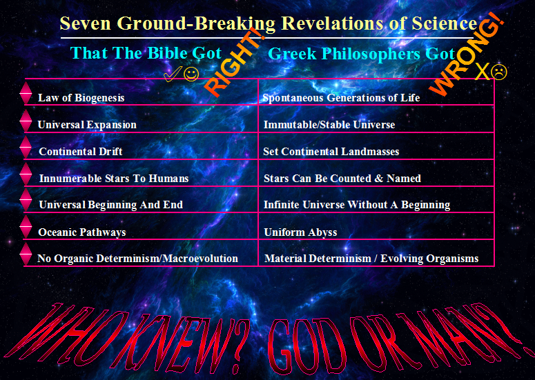 While noting the intellectual honesty of some former atheists, and their about-face concerning the existence of a deity, via naturally reasoning over DNA and various phenomena of existence, this work maintains that only the God who can explain life’s origin through an informational system, and His ordering of natural laws, not Aristotle’s god or some other mythical specter, can be credited as the God of all life. In Scripture we find the true God, for He expresses that life came from His preexistent Word or Message (see John 1:1-4); that life may be blotted-out (genetic extinction) of His Book of Life (cf. Ps. 69:28; 109:13; Rev. 20:15); that new, superior lifeforms will be created from among the faithful (cf. Isa. 65:20; 1 Cor. 15:37); that He expresses His works through human history (cf. Isa. 46:9-10); that His Word is Spirit and life (see John 6:63); that He creates spiritual and natural laws that bring all things to order in His greater purposes (cf. Ps. 50:16-21; Isa. 9:6-7; Col. 1:16-17); that within each of us is a record of base genes that manifests His works of life (discussed above); and that this timely, accurate record of creation can be discerned in His written account (cf. Deut. 32: 7-8; Isa. 48:16), which, I might add, is based upon a sensible, alphanumerical system of information that correlates with the order of the genetic code.
