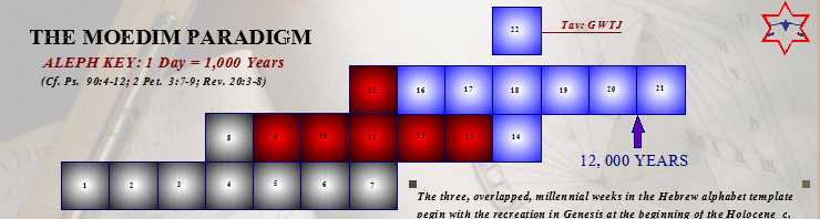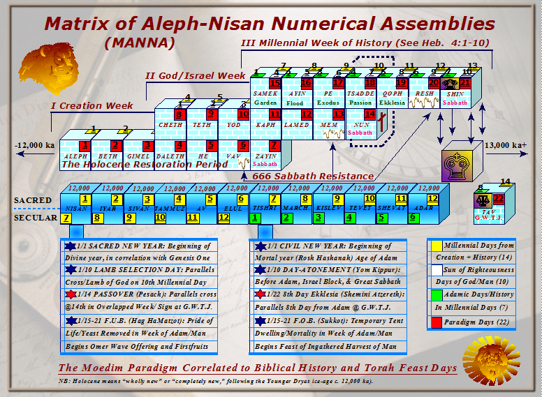 What exactly is the Moedim Paradigm? That is the question that I have often asked myself for almost two decades, long after assembling the alphanumerical template wherewith it could be visualized. From the beginning to the end of Scriptures- Genesis through Revelation– everything that I was led by the Holy Spirit to comprehend fits tenably within the twenty-two Hebrew letters of this panoramic time structure. From obscure enigmas in biblical psalms and proverbs to messianic parables, and back to the sacred feasts, all things have their place within the overarching template. And so I thought about the paradigm as the DNA instructions for assembling the Bible and perhaps as the hidden skeleton behind the body of Scripture, but no matter what sort of analogies I could think up, I was left with the same nagging question: ‘What is the Moedim Paradigm, and why would a universal template be designed by the Creator in the way this one is?’